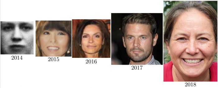 You can see in the image above how quickly the technology has progressed within just five years. Using NVIDIA’s StyleGAN1, the art has gone from a low-resolution black and white grainy portrait in 2014 to a life-like and highly-convincing portrait in 2018.