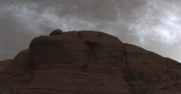 Curiosity over colourful clouds on Mars.