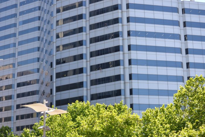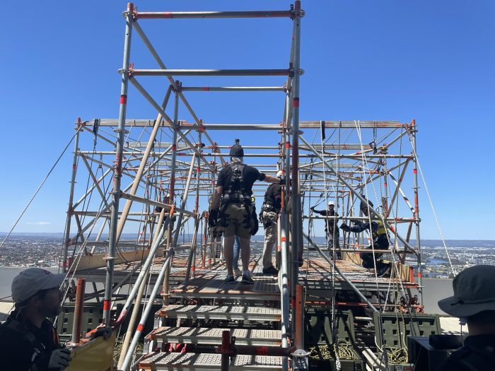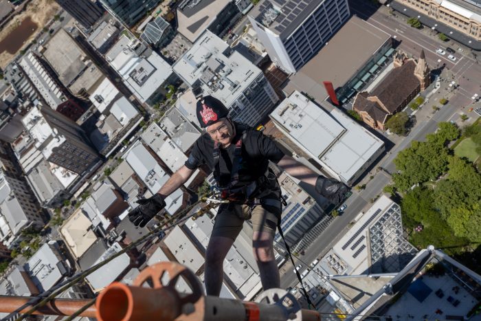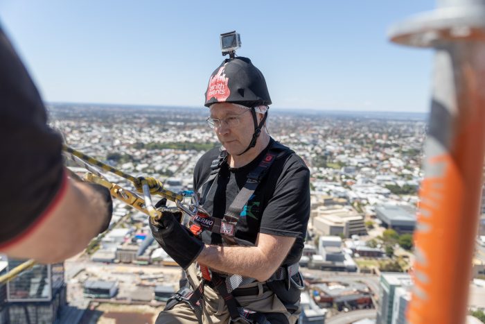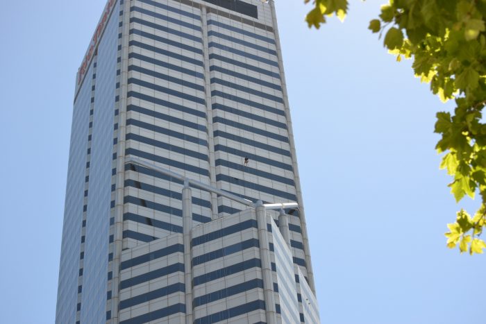 Mike abseiled some 52 floors, or 220 metres, from the top of Perth’s Central Park Tower. Photo below captures the moments before the plunge, with the clear blue sky as the backdrop.