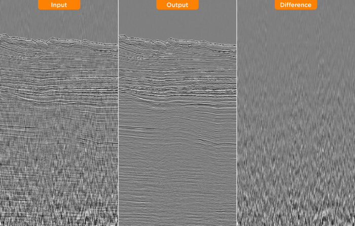 Stack sections before (left) and after (centre) DUG’s advanced deep-learning swell noise attenuation process. The difference (right) further demonstrates the power of this approach to isolate the swell noise without attenuating useful signal.