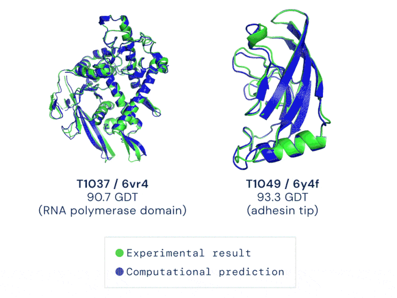 Two examples of protein targets in the free modelling category. AlphaFold predicts highly accurate structures measured against experimental results. GIF credit: DeepMind