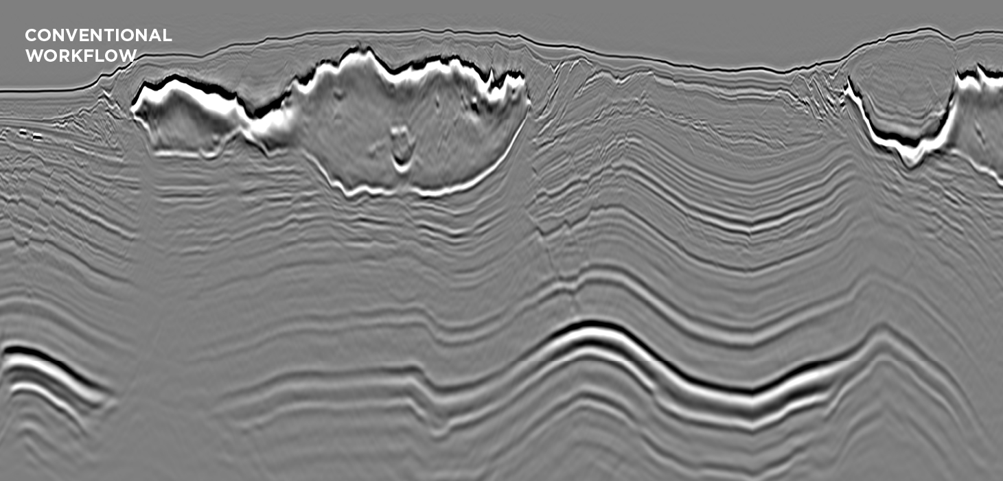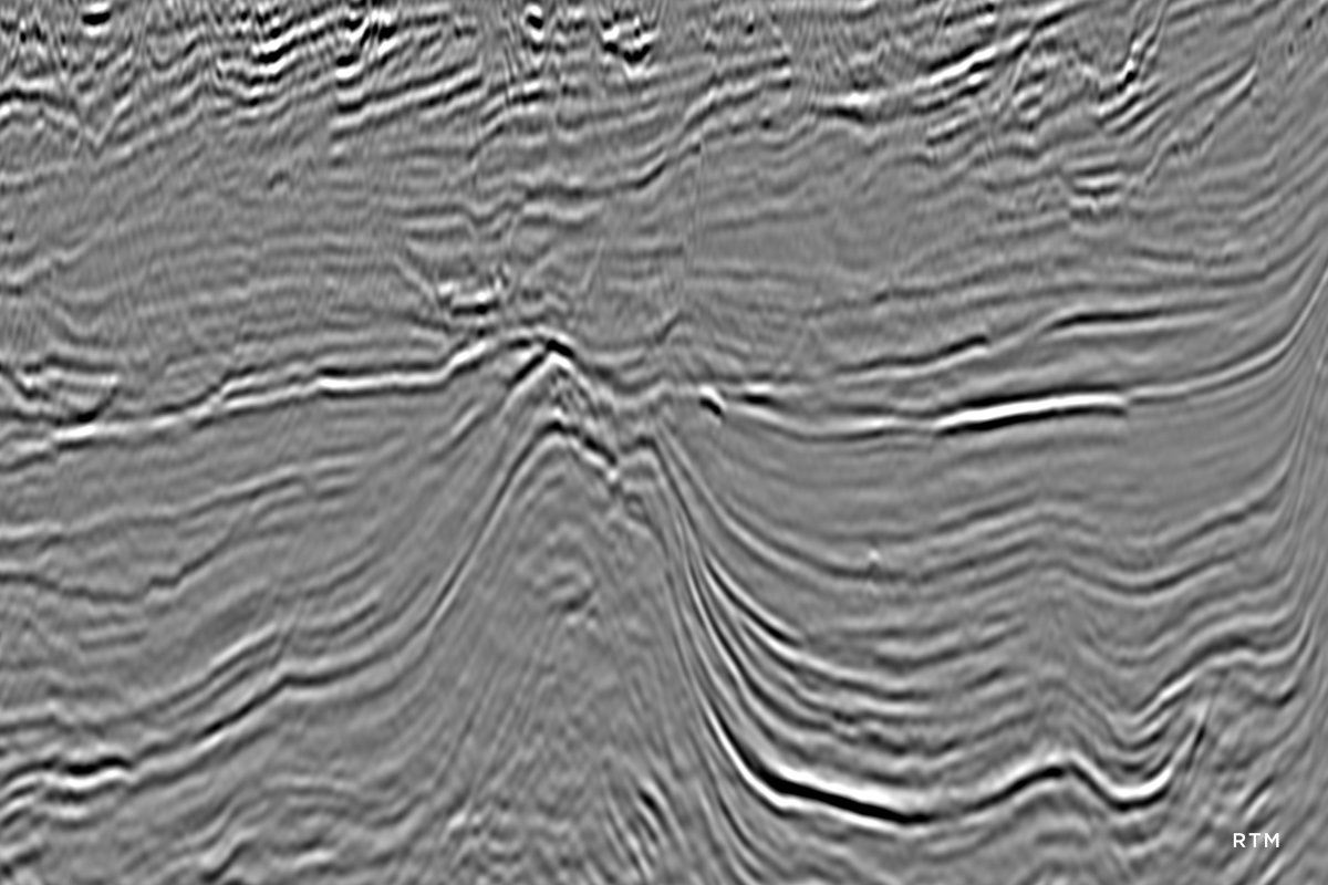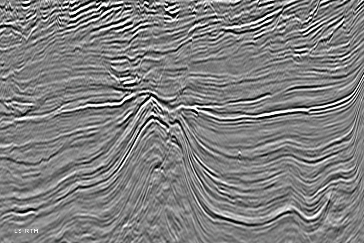 Least-squares RTM (left) offers a number of benefits over conventional RTM (right) including improved bandwidth and illumination plus a reduction in migration noise and acquisition footprint.