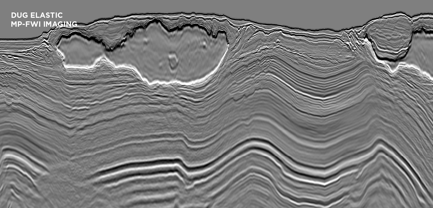 DUG Elastic MP-FWI Imaging solves for three-component reflectivity, Vp, Vs, P-impedance, S-impedance and density. (Data courtesy of Shell)