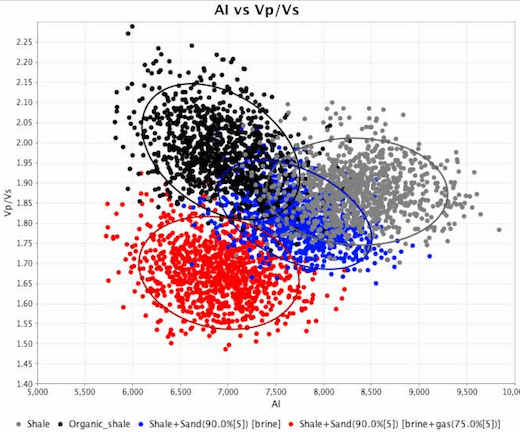 Seismic amplitude and rock property forward modelling is performed stochastically (using a Monte Carlo simulation) to capture the expected range of responses for all candidate lithology / fluid combinations over the depth range of interest.
