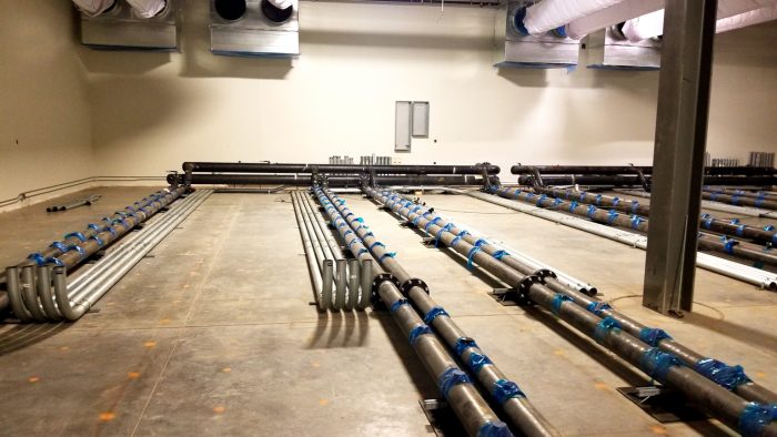 Inside, our electrical conduits are in place. With them, our DUG Cool system is taking shape. Many of the pipe manifolds (parts that branch into several openings) are already installed and installing the interior pipes is on schedule.