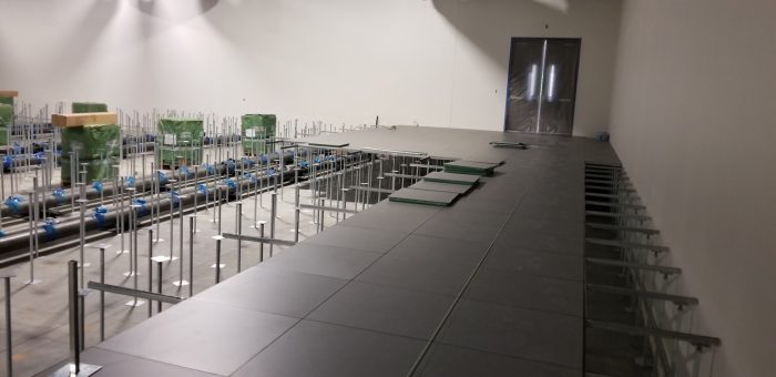 The datacentre’s false floor is taking shape, starting from the southwest corner. This is a raised access floor that goes over the top of the floor’s pipes that can be lifted to access the pipework below.
