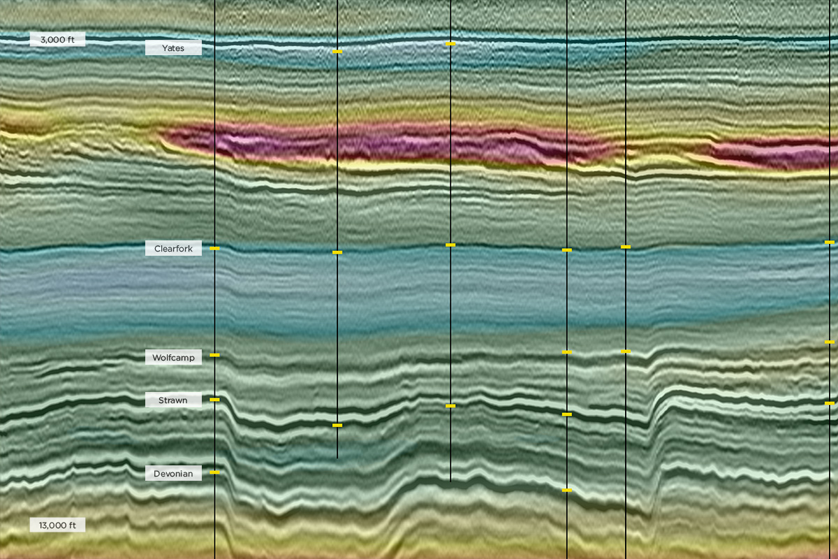 LAND IMAGING – ANISOTROPIC KIRCHHOFF PreSDM. Anisotropic (TTI) pre-stack Kirchhoff depth-migrated section from onshore Texas. Final velocity model and corresponding migrated stack after six iterations of anisotropic reflection tomography. Note the excellent match to the well markers over a range of depths. Multi-client data presented with permission from Geophysical Pursuit, Inc.