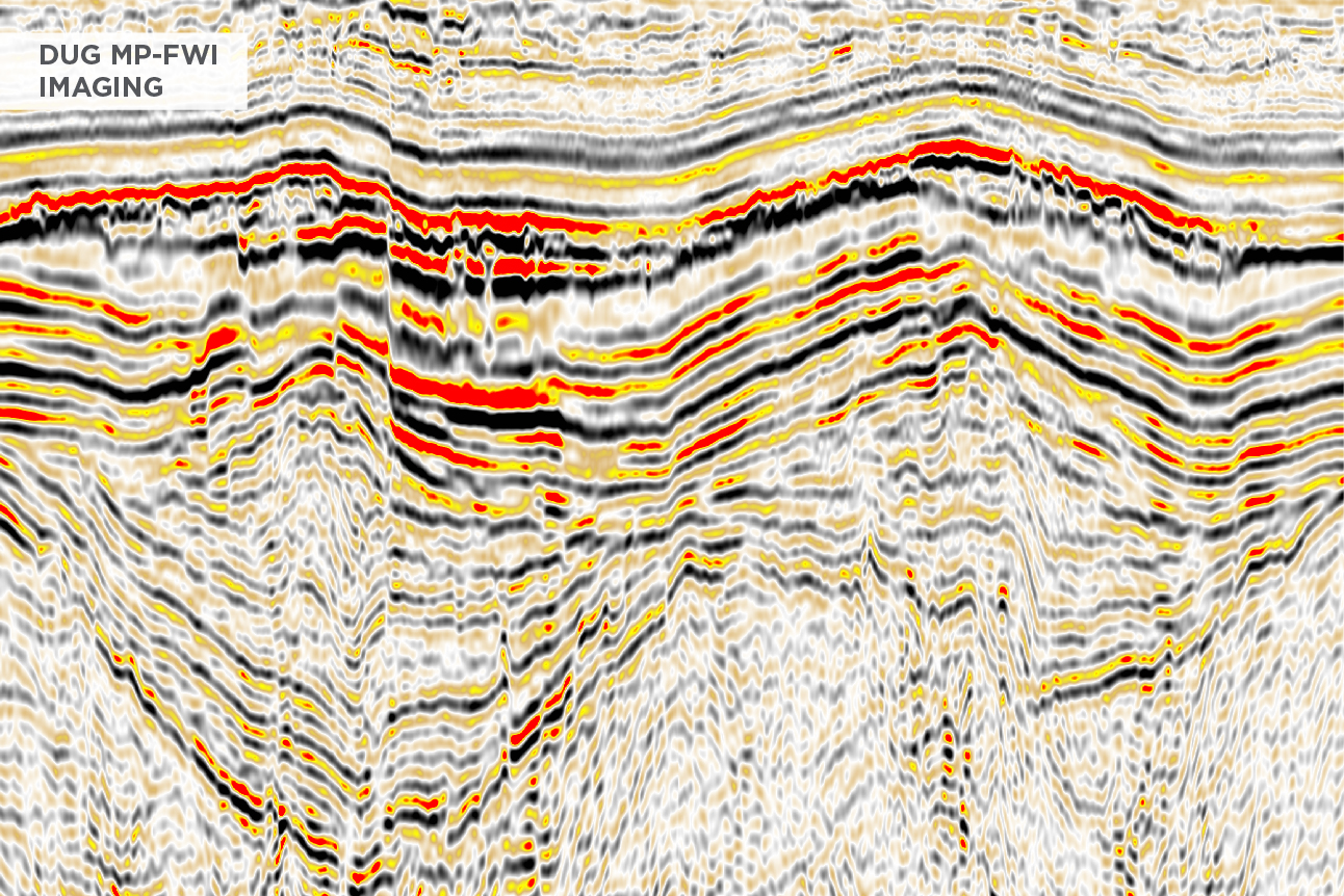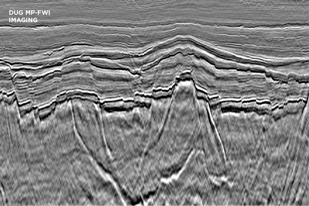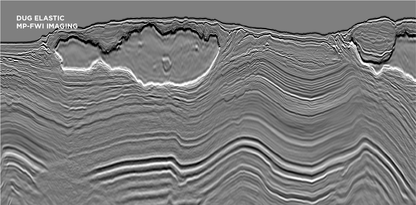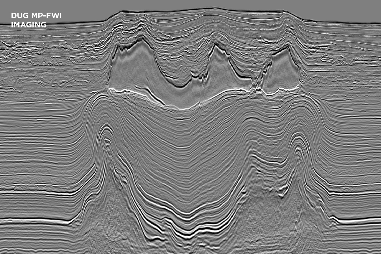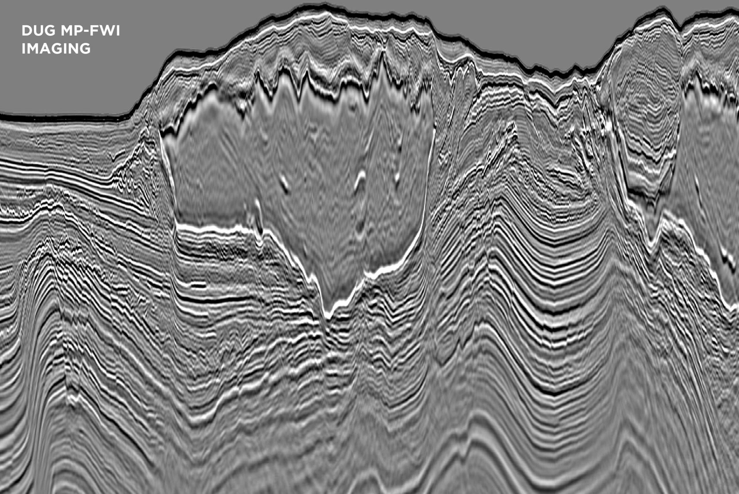 Resolving illumination issues caused by complex salt bodies has been a persistent geophysical challenge. DUG MP-FWI Imaging uses all parts of the scattered wavefield to reconstruct the reflectivity and kinematic Earth parameters. Naturally treating both up- and down-going wavefields, along with prismatic waves, multiples and ghosts as valuable information, guarantees significantly better subsurface sampling than primary-only imaging. This in turn delivers much-improved illumination, resolution and ultimately imaging of subsurface geology.