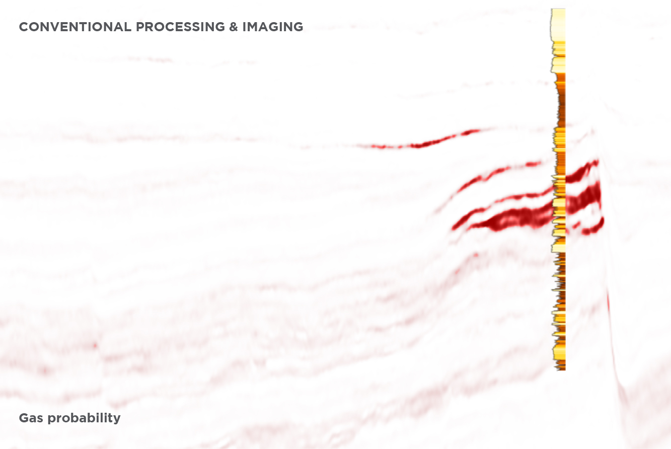 Gas probability after fluid and lithology prediction using a Bayesian classification framework. High probability is shown in red. Qualitatively the results are very similar—but note the vastly different workflows to get to each result. (BEX MC3D data courtesy of Multi-Client Resources)