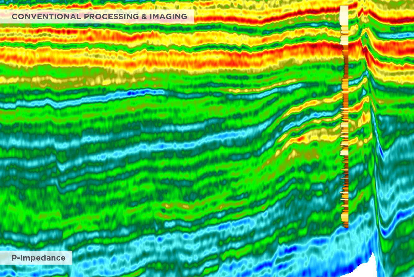 P-impedance. Warmer colours represent lower values. Simultaneous AVA inversion results using pre-stack reflectivity inputs from conventional processing and imaging (time pre-processing and Kirchhoff depth migrations) versus DUG MP-FWI Imaging using field-data input. (BEX MC3D data courtesy of Multi-Client Resources)