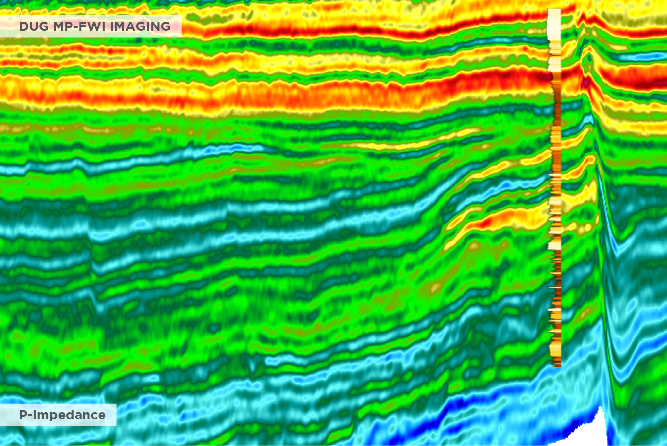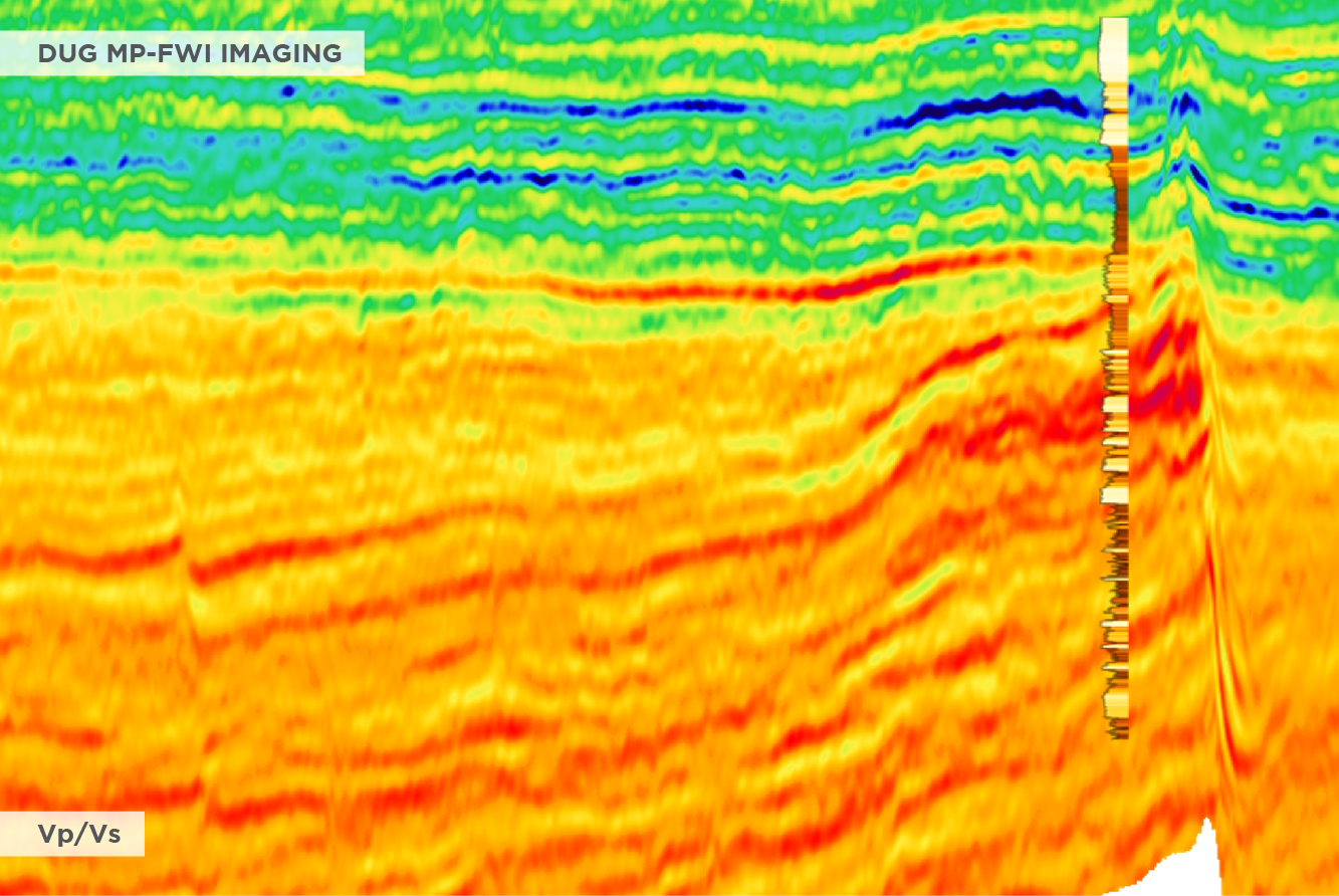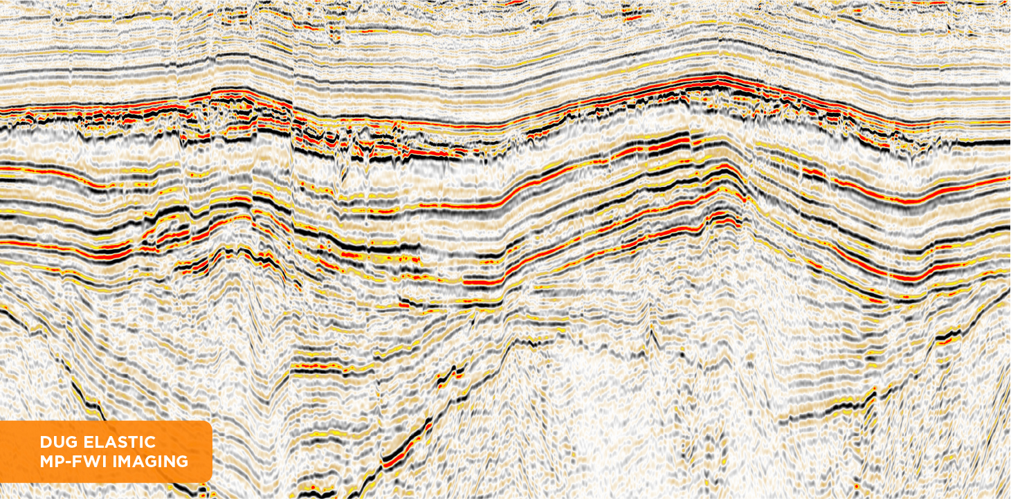Obtain unrivalled results faster with DUG’s Multi-parameter FWI (MP-FWI) Imaging technology. Simultaneous model building and high-frequency, least-squares imaging deliver accurate, high-resolution Earth models using field-data input—without the many time-consuming, subjective, serial steps of a conventional processing and imaging workflow. At high frequency, this revolutionary approach provides reflectivity images for both structural and quantitative interpretation, including angle stacks for AVA analysis. Our new elastic imaging technology solves for three-component reflectivity, Vp, Vs, P-impedance, S-impedance and density.