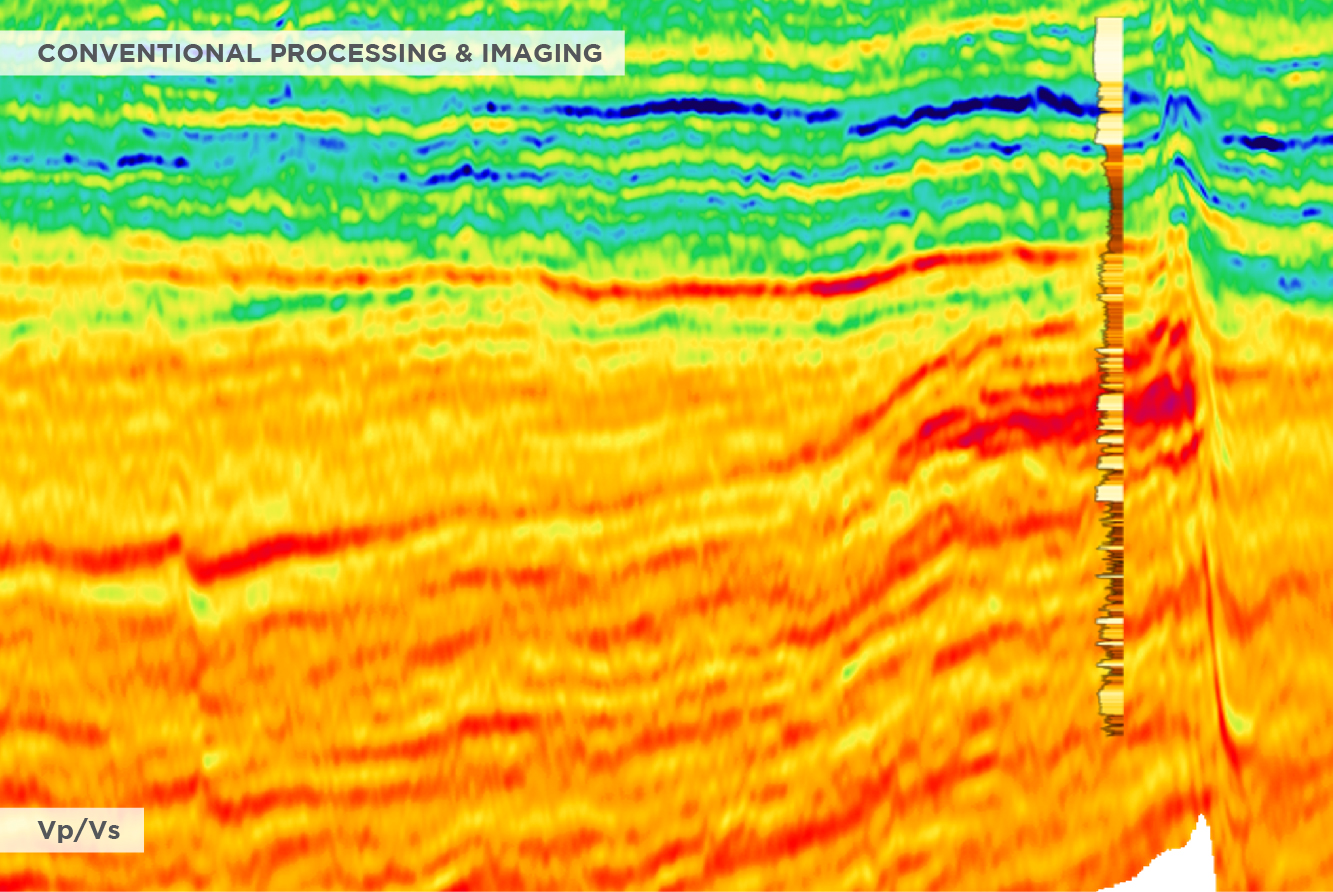 Vp/Vs ratio. Warmer colours represent lower values. Simultaneous AVA inversion results using pre-stack reflectivity inputs from conventional processing and imaging (time pre-processing and Kirchhoff depth migrations) versus DUG MP-FWI Imaging using field-data input. (BEX MC3D data courtesy of Multi-Client Resources)