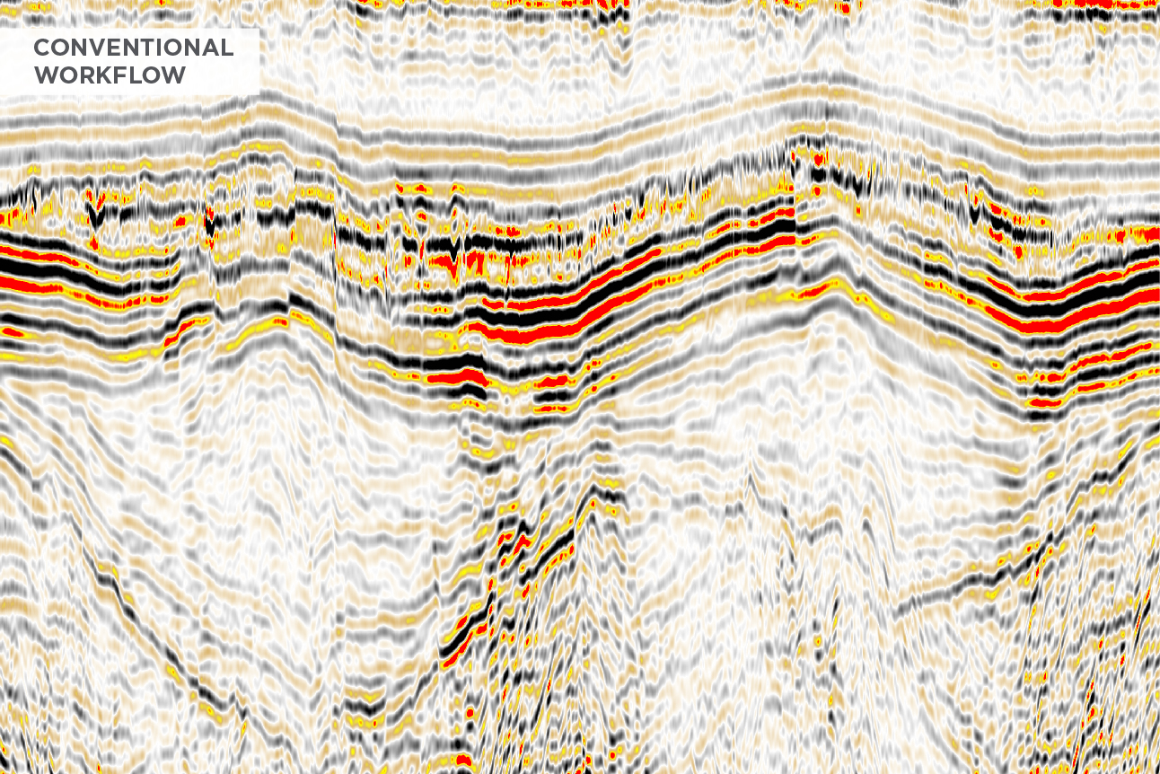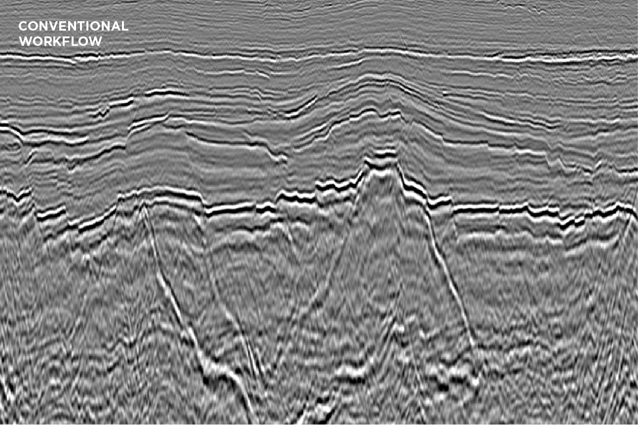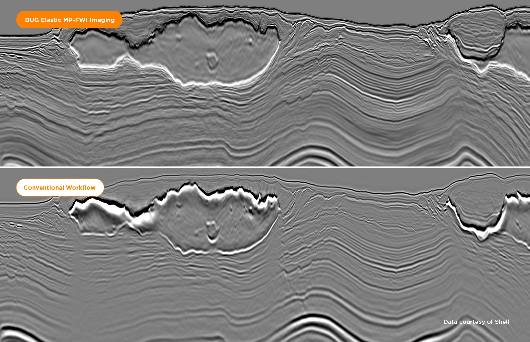 A comparison between imaging results in a complex salt environment, offshore Gulf of Mexico. Conventional reverse time migration (RTM), after pre-processing & regularisation versus DUG MP-FWI Imaging result using field-data input. Superior resolution. Superior imaging. (Data courtesy of Shell)