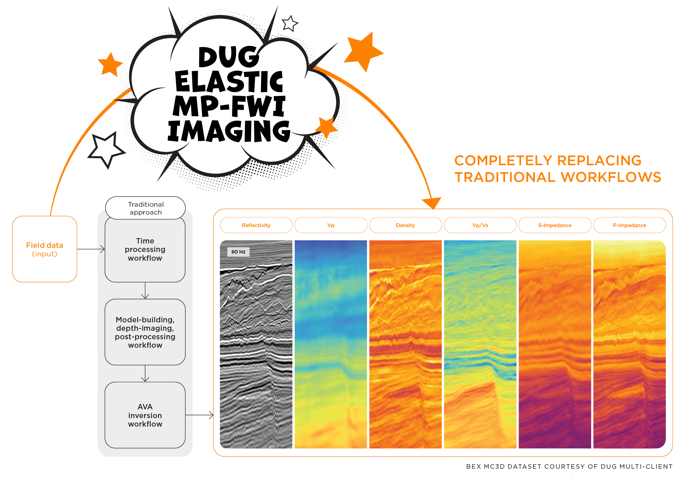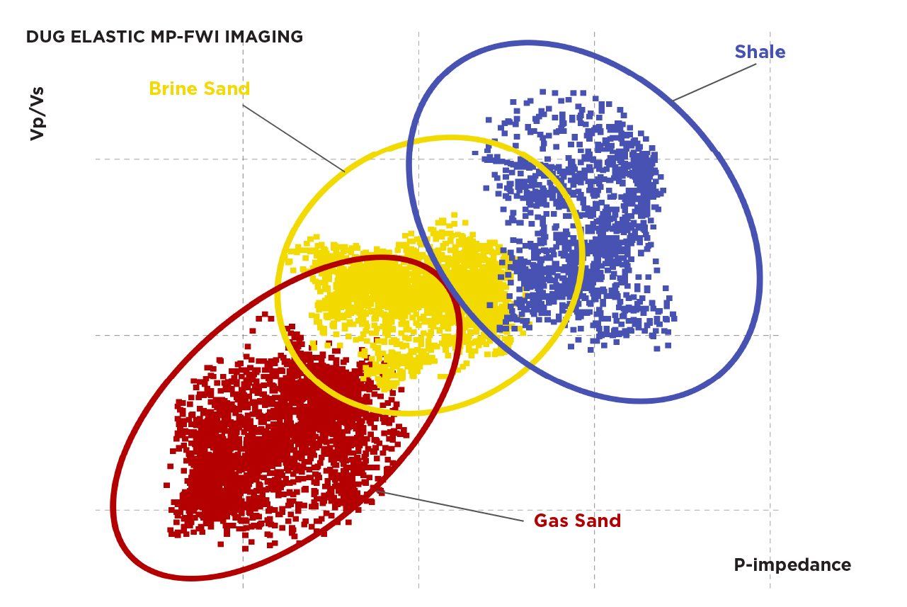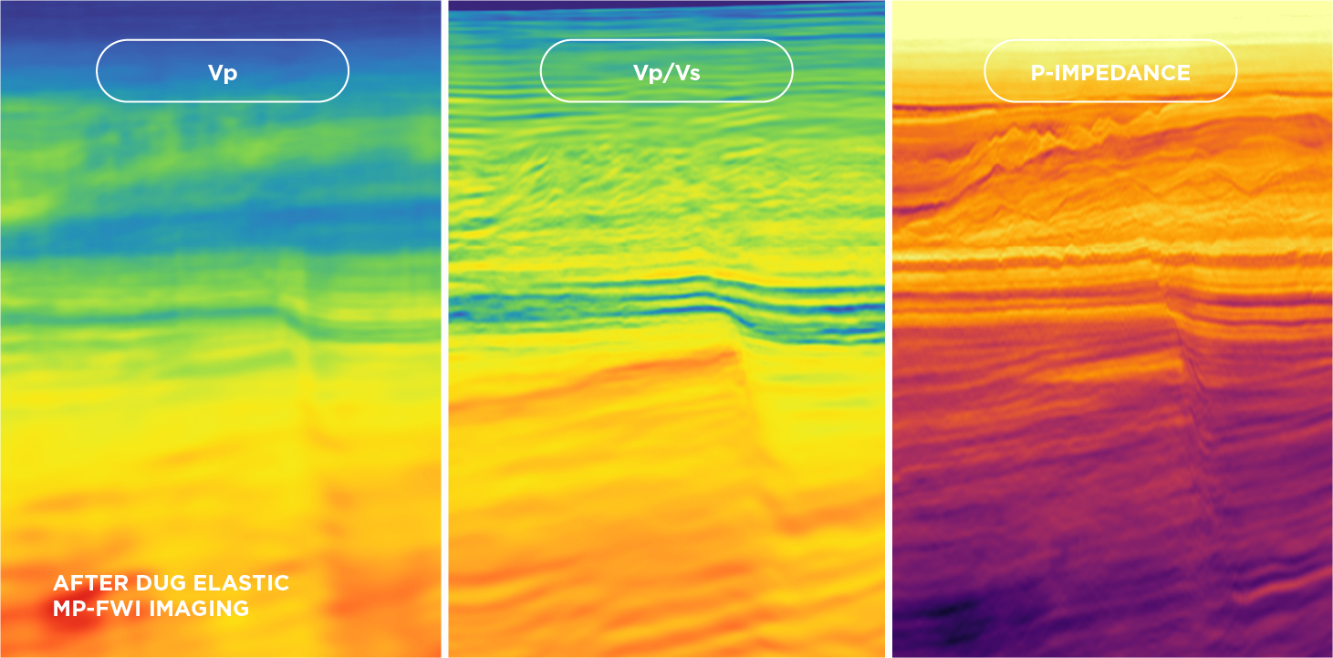 DUG Elastic MP-FWI Imaging delivers high-resolution elastic rock property outputs — directly from field data. By eliminating the need for conventional pre-processing and imaging workflows, and a post imaging AVA inversion workflow, (along with their assumptions/workarounds that ultimately affect the AVA compliance of the data) more certain predictions can be realised.