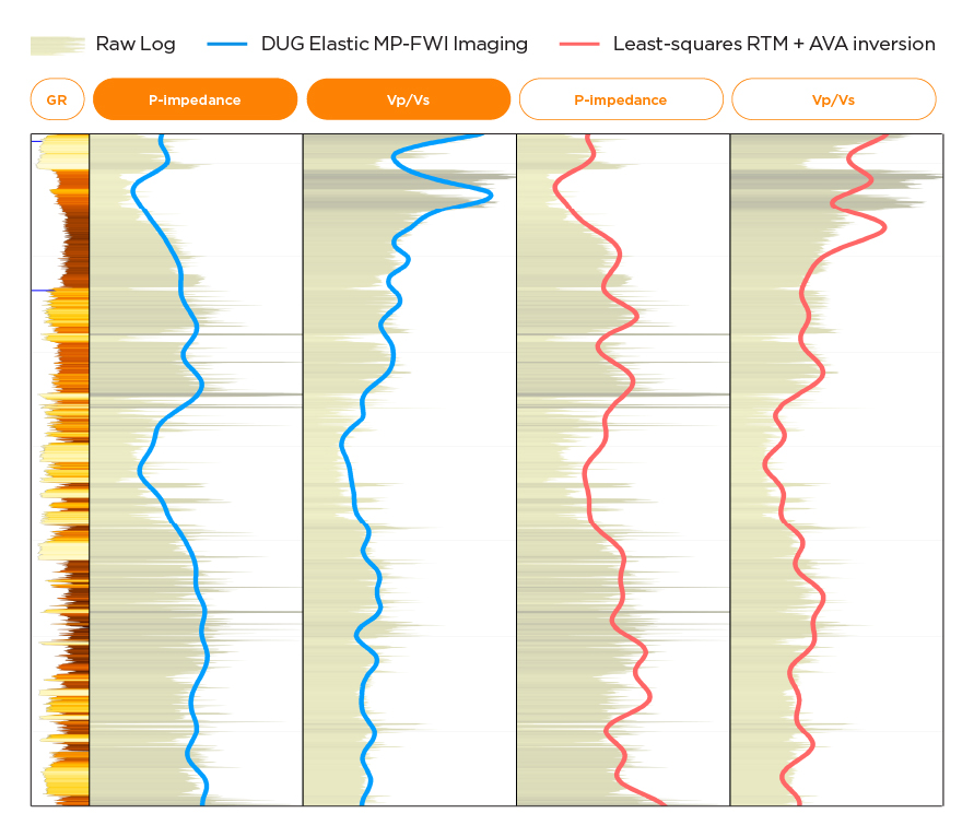 Here we compare the elastic rock property well ties from DUG Elastic MP-FWI Imaging to a conventional processing, imaging and AVA inversion workflow. It is obvious that the Elastic MP-FWI Imaging results are a better match to the well. (Data courtesy of DUG Multi-Client)