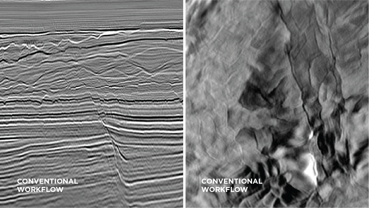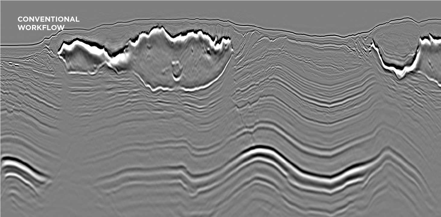 Land seismic data, such as this example, can often exhibit strong elastic effects that violate the assumptions of acoustic imaging. This desert setting has geological complexity both in the near-surface and at the target depth, including high-impedance carbonates. Conventional pre-processing workflows are non-trivial, especially on land data, where stages such as demultiple often require complex modelling and adaptive subtraction workflows. Significantly better illumination and event continuity is obvious when comparing the sections.