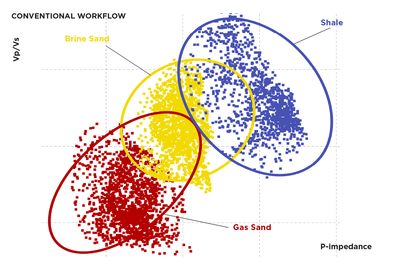 Here, two equivalent crossplots of elastic rock properties are compared. The ellipses indicate the expected distribution of the labelled lithology and fluid combinations from statistical rock physics analyses of well log data. Quantitative interpretation requires true amplitudes and high signal-to-noise ratio. Less scatter translates to less uncertainty. (Data courtesy of DUG Multi-Client)