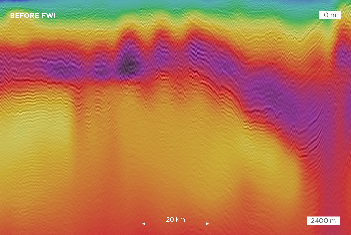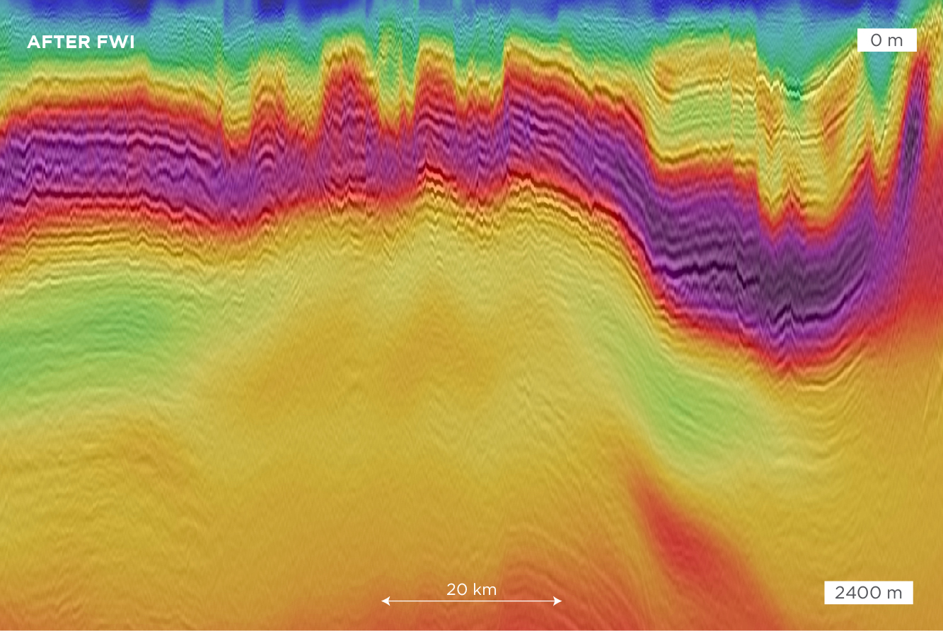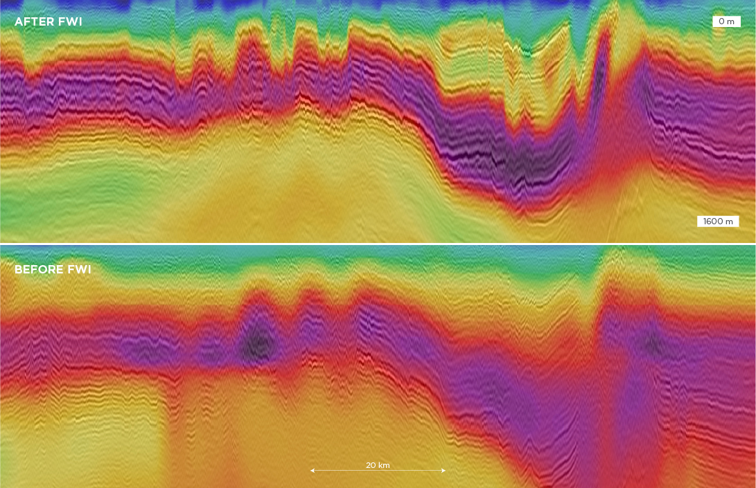 Migrated stack co-rendered and imaged with the velocity model prior to FWI versus migrated stack co-rendered and imaged with the FWI velocity model.