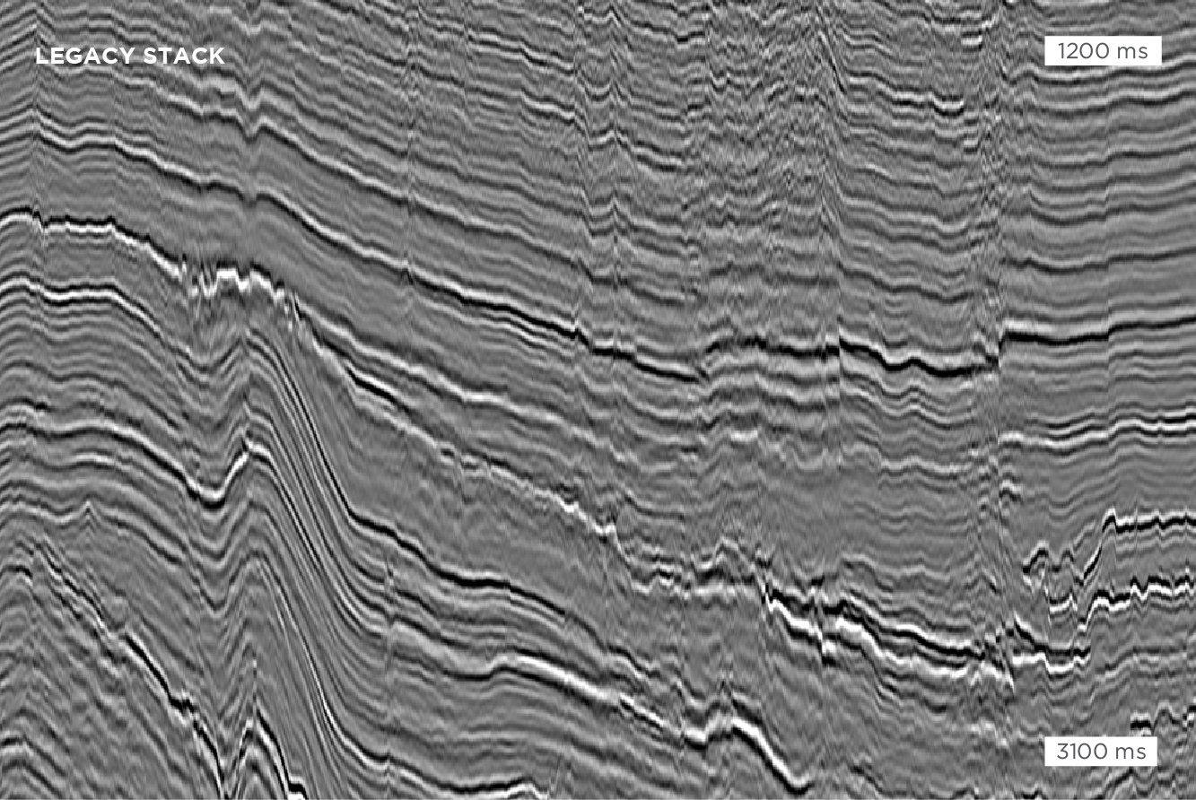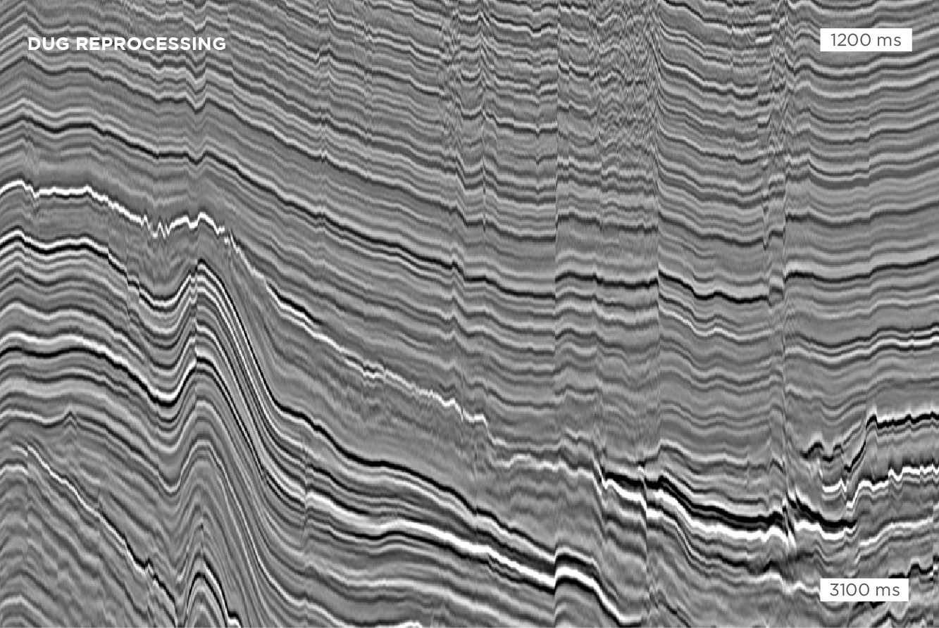 Legacy stack compared to DUG’s reprocessed result. As well as the imaging uplift provided by FWI, significant pre-processing improvements from cross-spread FKK noise removal and multiple suppression using true-azimuth 3D SRME were achieved.