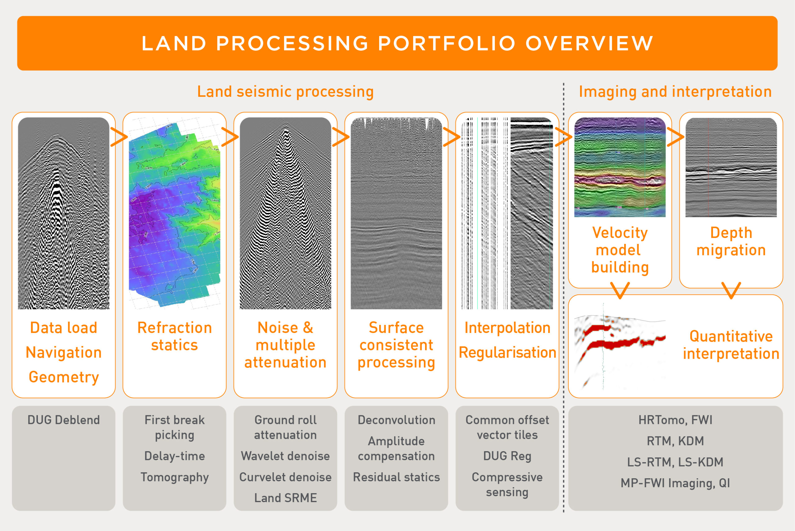 Our technology spans solutions for statics, a wide variety of options for noise and multiple attenuation, full-azimuth processing and advanced reconstruction and regularisation algorithms which include support for compressive sensing. This is combined with our modern model building and imaging tookit including MP-FWI Imaging.