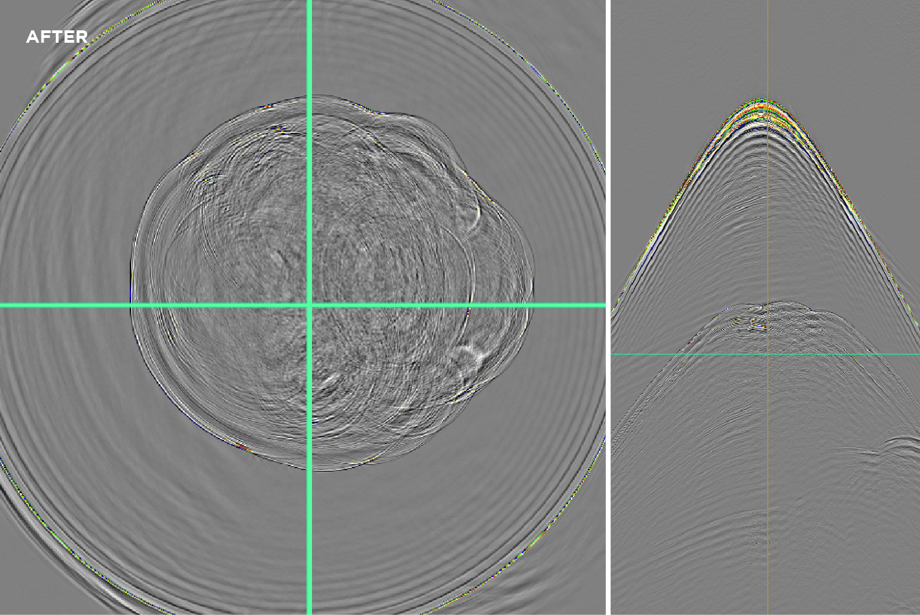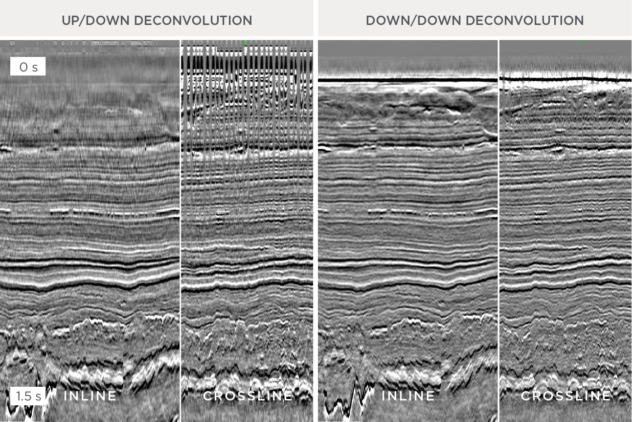 Up/down deconvolution using the upgoing wavefield (left) compared to down/down deconvolution using the down-going wavefield (right). The down-going wavefield can significantly improve near-surface imaging when processed with DUG’s exclusive down/down deconvolution algorithm. (Data courtesy of Carbon Transition and TGS)
