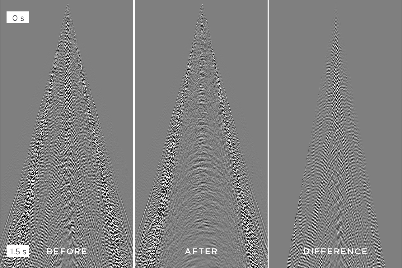 Eliminate troublesome Vz noise with our patent-pending joint sparsity recovery approach. Harness the power of up/down deconvolution and, exclusively to DUG, down/down deconvolution to apply 3D deghosting, designature and demultiple in a single step to produce superior images with the down-going wavefield.