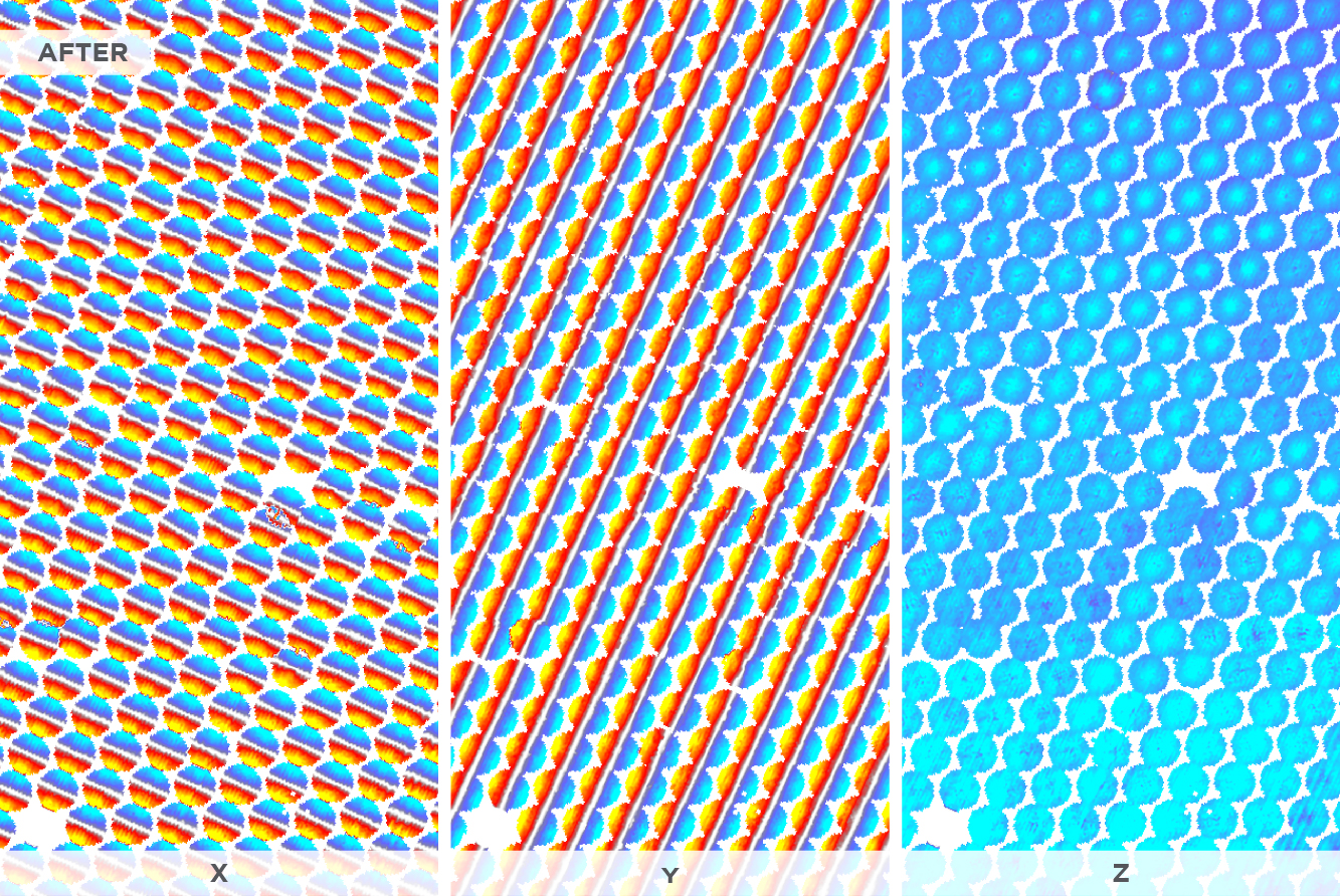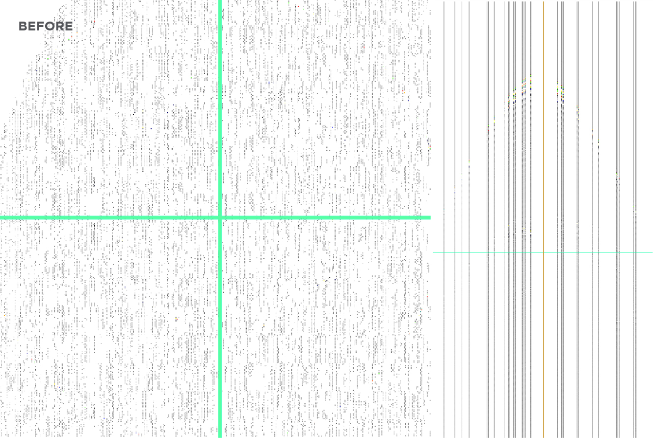 3D receiver gather before and after shot carpet regularisation. (Data courtesy of Shell)