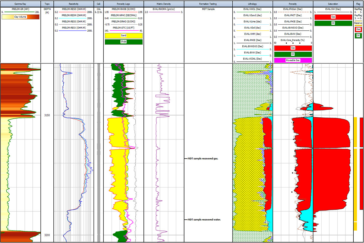Composite log plot illustrating petrophysical interpretation over a gas-bearing sand interval.