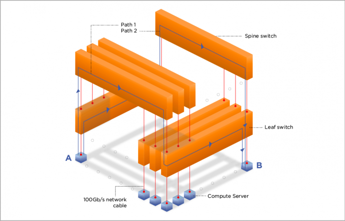 As can be seen in the fat-tree diagram, there are multiple equal-cost paths from A to B. With a well implemented fabric, you can lose any spine and only suffer a drop in aggregate bandwidth (eg. 1/16 bandwidth in the example). If you lose a leaf, you lose connectivity to the compute servers attached.