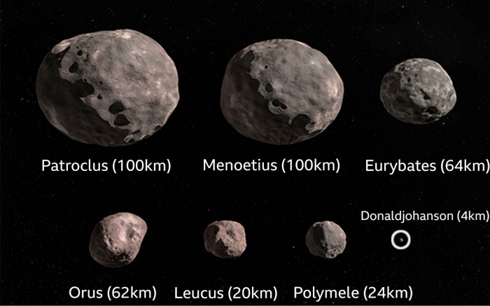 Lucy’s flyby targets and their estimated size. Photo credits: NASA