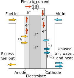 In a fuel cell, hydrogen molecules are split into protons and electrons at the negative terminal of the cell, or the anode. Electrons flow through an external circuit, generating a flow of electricity that allows you to drive the car. Meanwhile, protons migrate through the electrolyte to the positive terminal, or cathode, where they unite with oxygen and electrons to produce water and heat.