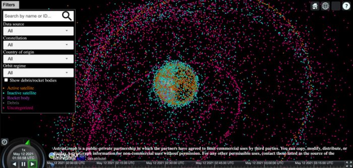AstriaGraph, an open access tool to visualise resident space objects, developed by Moriba Jah at the University of Texas at Austin. The map revealed more than 200 potential “super spreader” events.