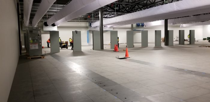 Inside the datacentre, the floor is 99% complete — with holes being cut to accomodate Bubba’s cooling pipes. This is very precise work, when there are 722 tanks to accomodate in this room everything needs to fit just right.