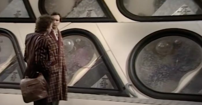 The Hitchhiker’s Guide to the Galaxy’s Ford and Arthur checking out cryogenic pods with millions of people from Golgafrincham in an attempt to colonise Earth. Photo credit: BBC/YouTube